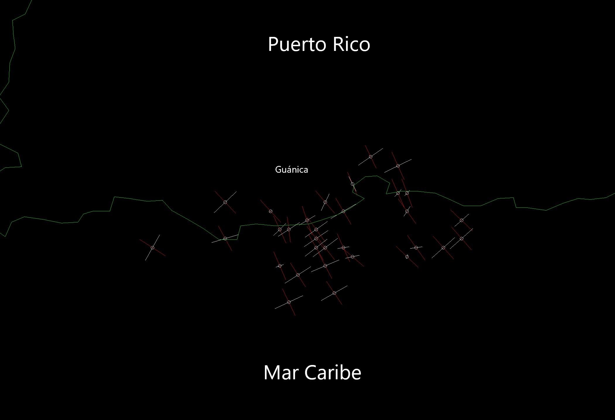 Se adjuntan los desplazamientos en las componentes N, E y Z(up) de la estación PRGY en Guayanilla en el SW de Puerto Rico para los últimos meses. Nótese el aumento sustancial en la N hacia el día 7 de enero, día en que ocurrió el terremoto de magnitud 6.4. Así mismo, nótese el desplazamiento en dirección opuesta a la E, o sea, en dirección W y luego, el incremento en la Z y su posterior regreso a la elevación promedio, lo que indica que al menos después del evento principal los esfuerzos fueron extensionales, coherentes con los mecanismos focales y las direcciones de esfuerzos producto de la data sísmica.